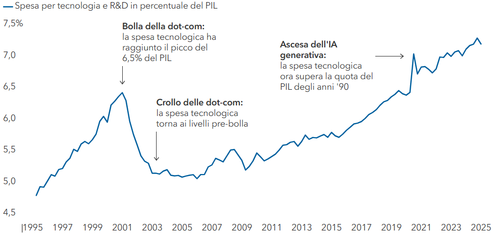 Fonte: US Census Bureau, Bureau of Economic Analysis, Haver Analytics, Capital Group. R&D sta per ricerca e sviluppo. Dati al 20° agosto 2025.
