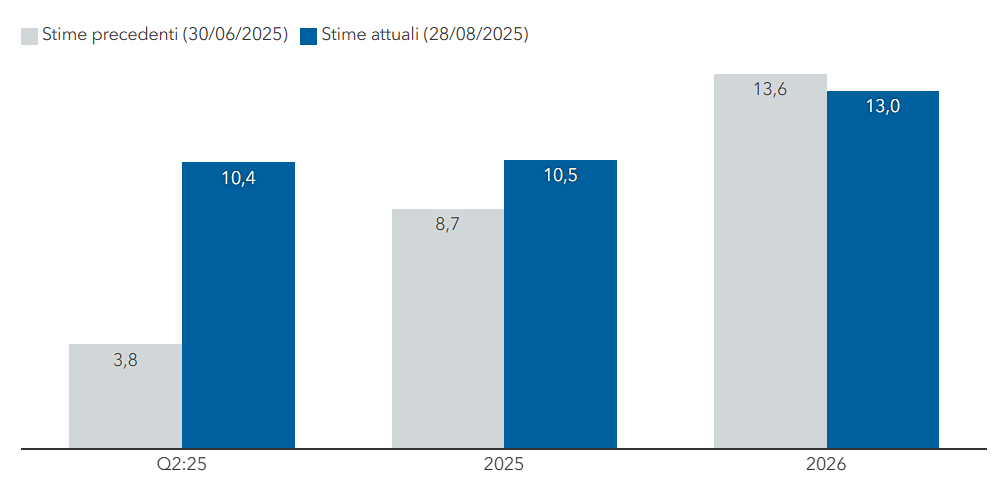 Fonti: Capital Group, FactSet. Dati al 28° agosto 2025. Stime di crescita degli utili aggregate da FactSet sulla base delle ricerche degli analisti sul lato vendita.
