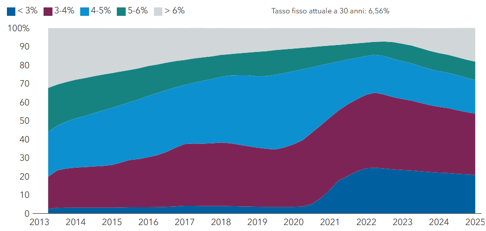 Fonti: Capital Group, FHFA, National Mortgage Database. Quota dei tassi di interesse al 31 marzo 2025. Tasso ipotecario fisso corrente a 30 anni al 28 agosto 2025.