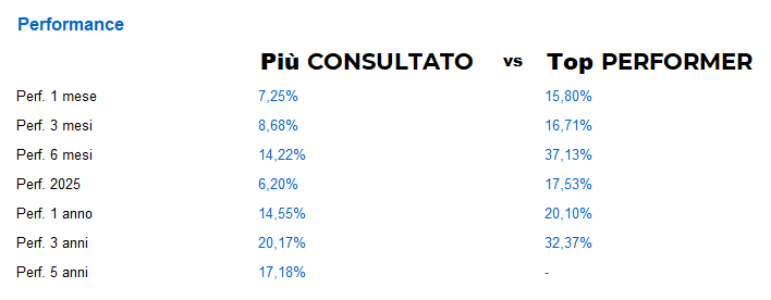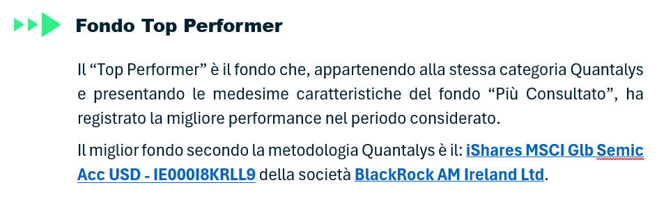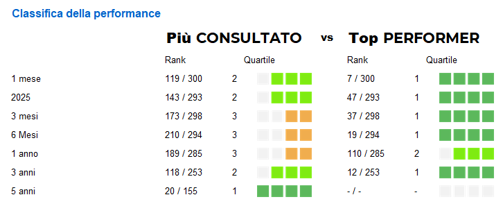 * La metodologia utilizzata per l'elaborazione dei dati è interna a Quantalys. I calcoli sono aggiornati al 30/09/2025. I calcoli sono effettuati da Quantalys e sono basati sui dati inviati giornalmente dalle società di gestione. Eventuali errori o omissioni sono di esclusiva responsabilità di Quantalys. Nonostante la massima cura prestata nella raccolta, nella verifica e nell’elaborazione dei dati provenienti da fonti ritenute affidabili, Quantalys non garantisce che i dati ricevuti siano accurati. Tutti i calcoli sono effettuati in euro.