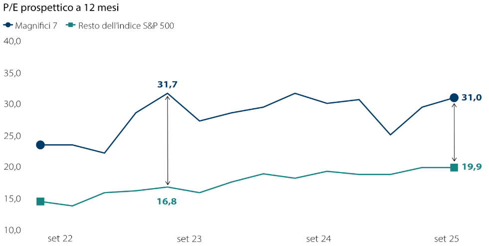 Fonte: FactSet. Il rapporto prezzo/utili (P/E) forward viene calcolato dividendo il prezzo delle azioni per le stime di consensus sugli utili a 12 mesi. Il rapporto P/E forward per i Magnifici 7 corrisponde alla media ponderata per la capitalizzazione di mercato. Dati al 30 settembre 2025.