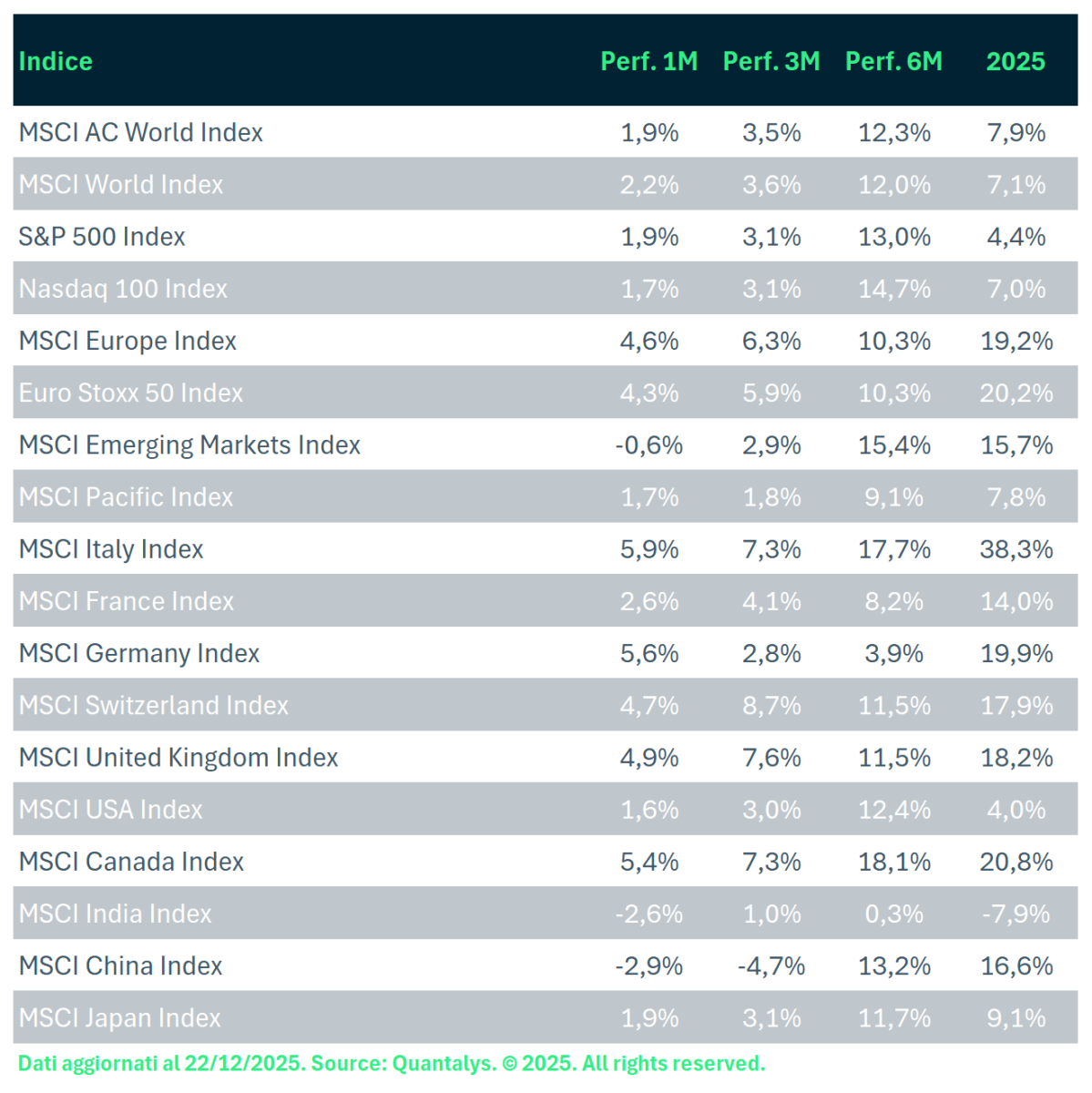 © 2025 Quantalys. Tutti i diritti riservati. Le informazioni fornite sono di proprietà di Quantalys Italia Harvest Group; possono non essere esaustive e non costituiscono raccomandazione o sollecitazione all’investimento. Quantalys Italia Harvest Group non si assume alcuna responsabilità per le eventuali conseguenze derivanti da decisioni assunte o iniziative intraprese sulla base delle informazioni riportate nel presente documento. Tutti i dati sono aggiornati alla data indicata e attribuiti a Quantalys Italia Harvest Group, salvo diversa indicazione.