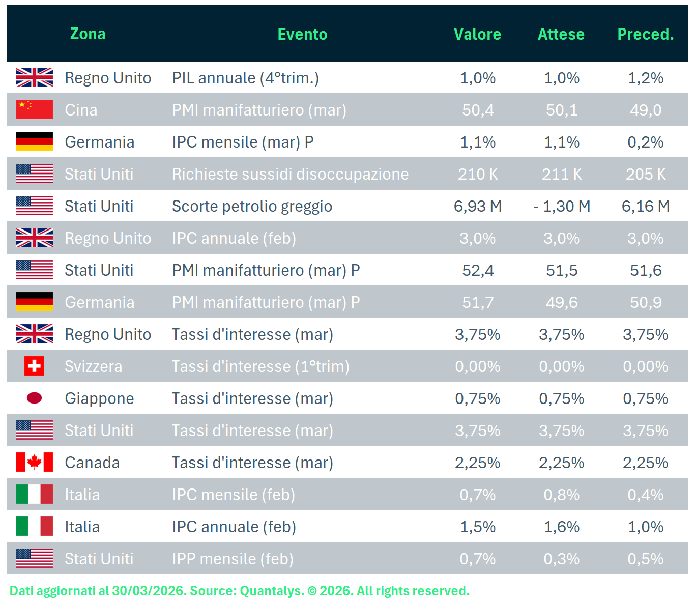 © 2026 Quantalys. Tutti i diritti riservati. Le informazioni fornite sono di proprietà di Quantalys Italia Harvest Group; possono non essere esaustive e non costituiscono raccomandazione o sollecitazione all’investimento. Quantalys Italia Harvest Group non si assume alcuna responsabilità per le eventuali conseguenze derivanti da decisioni assunte o iniziative intraprese sulla base delle informazioni riportate nel presente documento. Tutti i dati sono aggiornati alla data indicata e attribuiti a Quantalys Italia Harvest Group, salvo diversa indicazione.